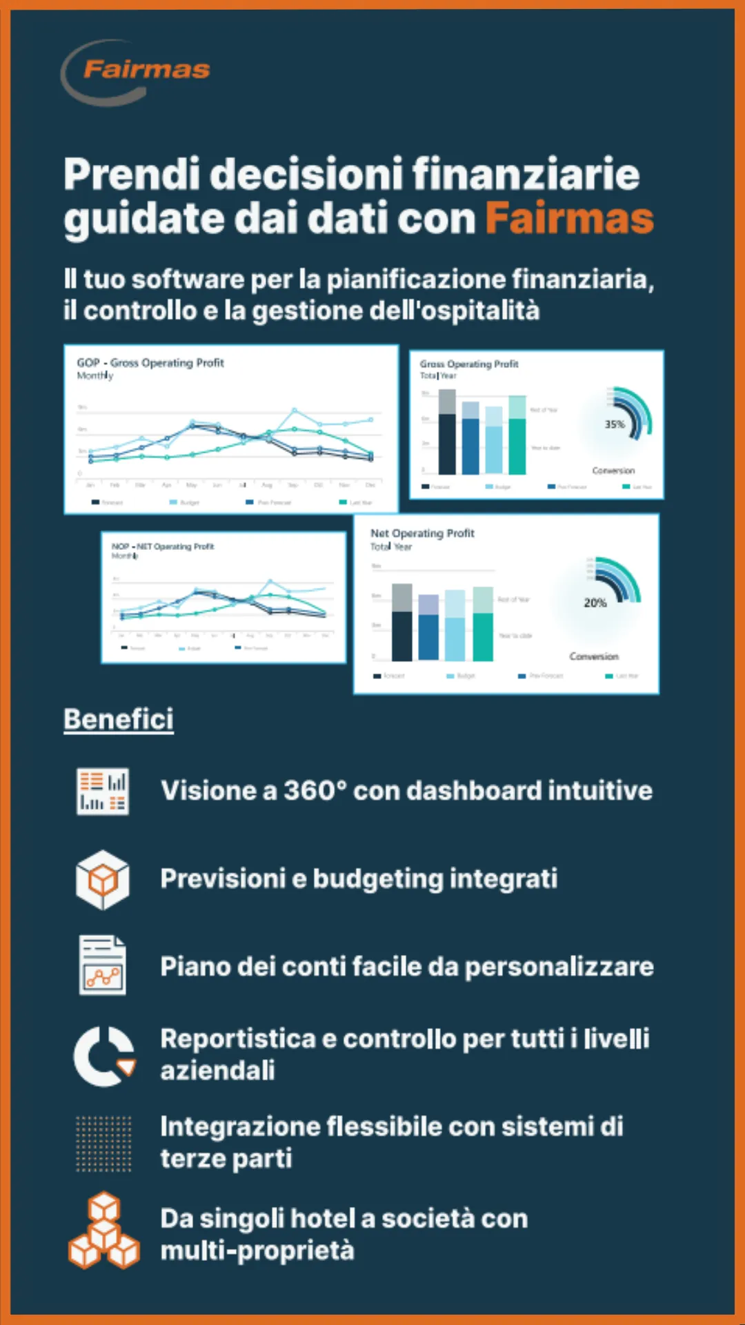 Fairmas sviluppa software di pianificazione finanziaria, controllo e reporting gestionale progettati specificamente per il settore alberghiero globale. Fondata nel 2003, Fairmas è diventata un fornitore leader a livello mondiale di software di BI finanziaria per operatori alberghieri e investitori. Il nostro software, basato sul web, si integra perfettamente negli ambienti IT alberghieri esistenti, collegandosi senza difficoltà con oltre 200 principali sistemi PMS, contabili, RMS e altri. Offriamo anche un reporting standardizzato e automatizzato delle risorse alberghiere per semplificare e unificare le informazioni sulle prestazioni del portafoglio.